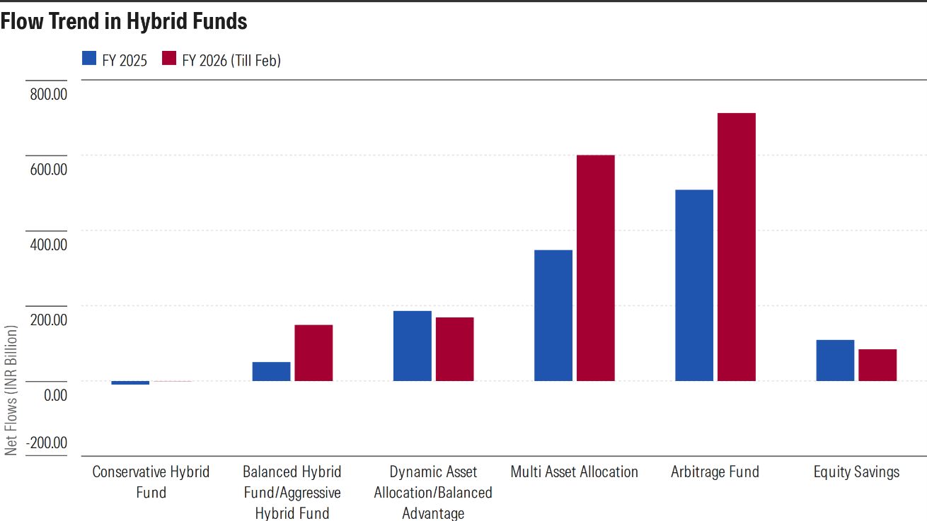 Hybrid strategies appear to have benefited from the uncertain and volatile market environment of FY2026. These funds have attracted investor interest because of their ability to balance risk and return through allocation across asset classes, offering a relatively smoother investment experience during uncertain periods.